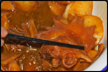 Es gibt Ochsenknochen und geschmortes Huhn in einer sehr schmackhaften Soße.