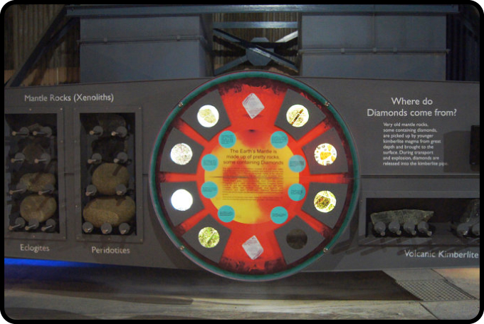 Vitrinen sind Rohdiamanten zu sehen und es werden fertig geschliffene