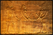 ganz Außen zeigen die Opferung von Gefangenen durch den Pharao. Zwei mächtige Steinfalken, Sinnbilder des Gottes Horus,