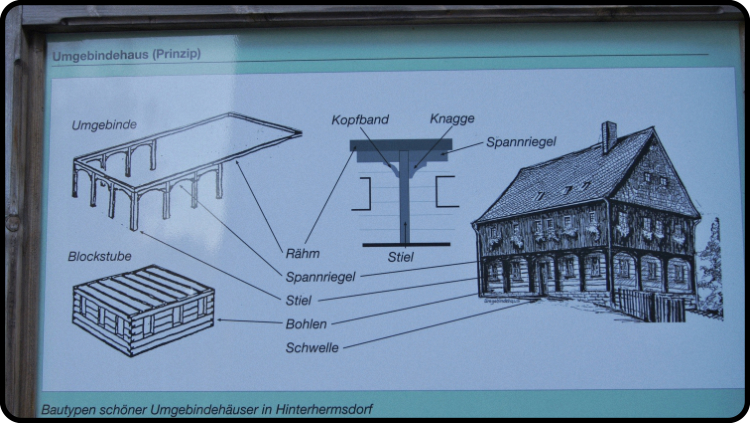 Bei unserer ersten Erkundung durch Hinterhermsdorf fallen die für diese Gegend typischen Umgebindehäuser auf. Dabei wird der erdgeschossige Baukörper durch ein Stützensystem von der Last des darüber befindlichen Geschoßes bzw. Dach entlastet.Eine Informationstafel im Ort beschreibt die Bauweise.