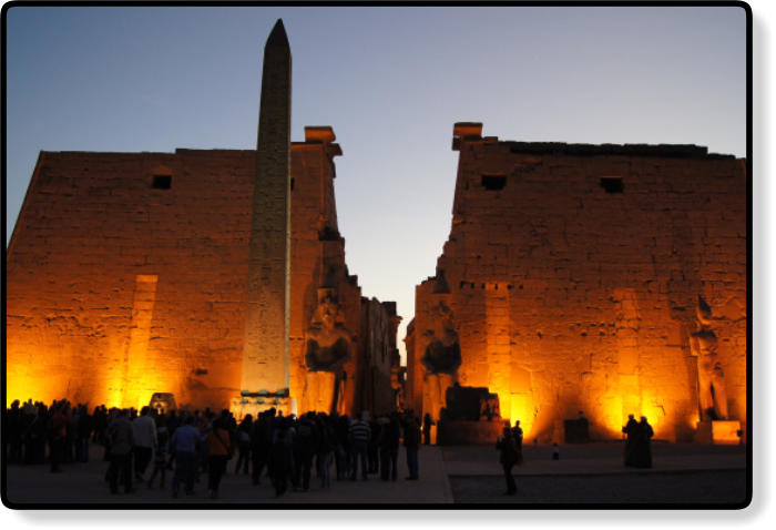 Vom Karnak-Tempel fahren wir die kurze Strecke zum Luxor-Tempel. Die Dämmerung hat bereits eingesetzt, so dass die folgenden